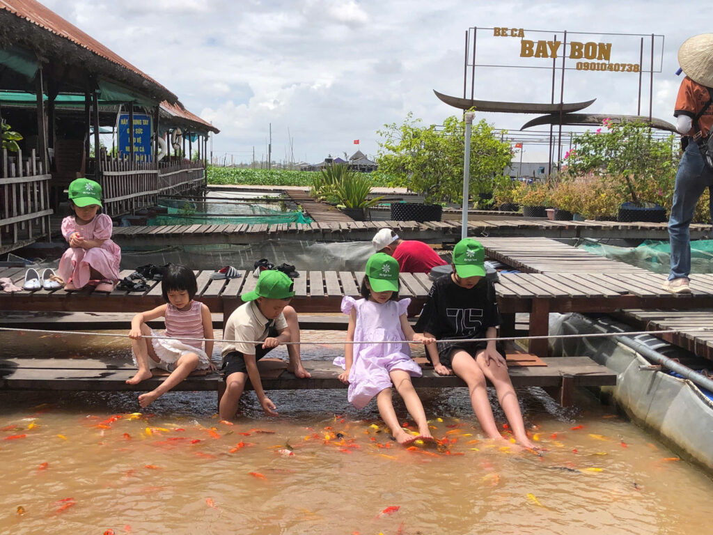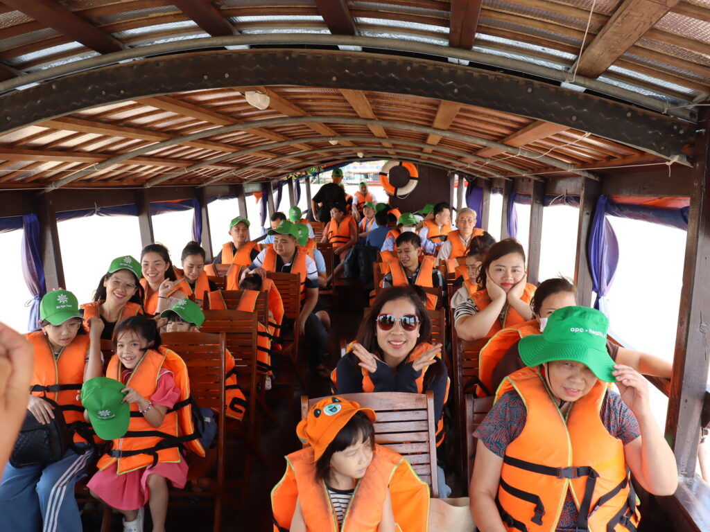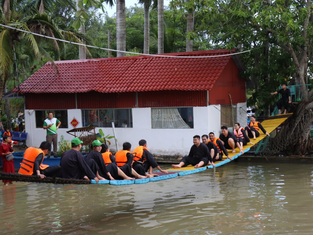 Cả đoàn tiếp tục di chuyển lên phà sang khu du lịch Vinh Sang. Tại đây, Gia đình Big Tree đã được thay những “bộ đồ bà ba” đặc trưng của người miền Tây để “lao” ngay ra đồng tát mương bắt cá, chơi những trò chơi team building đậm chất miền Tây như tát mương bắt cá, đi cầu khỉ, đu zipline, cầu lắc, ,… Ai cũng cười mệt xỉu, nhưng lòng thì vui hết biết. Mọi người đoán xem team nào sẽ chiến thắng trong trò chơi cầu lắc nhé ???