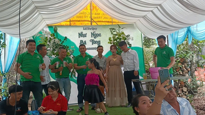 Buổi lễ bắt đầu bằng nghi thức rước dâu, không phải bằng xuồng hay đi bộ như nhiều người hình dung khi nói về miền Tây, mà là bằng đoàn xe nối đuôi nhau chạy bon bon trên con đường làng nhỏ, xuyên qua những hàng dừa, bụi chuối, bờ ruộng. Dù không ghe xuồng, nhưng không khí vẫn rất “miền Tây” – nhẹ nhàng, chan chứa tình cảm.