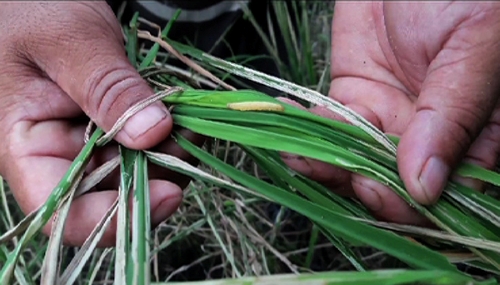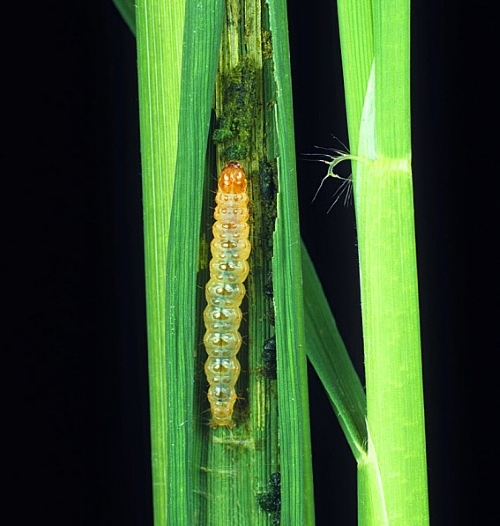 - Lá lúa bị cuốn lại thành ống hoặc hình trụ, bên trong có sâu non hoặc tơ trắng.